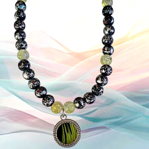 A small handmade pour painting on a chain of metal and glass beads, a truly one of a kind piece!